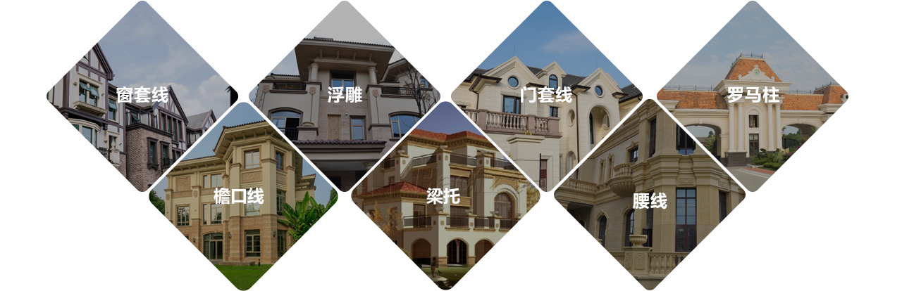 主要有羅馬柱、窗套、門(mén)套、花盆、檐口線條、腰線、山花、梁托、花瓶欄桿等多種造型,表面可涂刷各種外墻涂料。